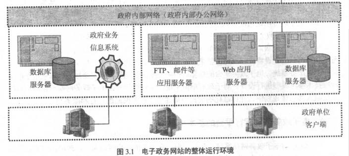 个完整的电子政务网站系统由包括面向公众服务的门户闯站系统、政府部门内部办公网络,以及基于 定的安全和数据共享与交换共享机制有效集成和整合的政府业务信息系统(例如那些基于c/s结构的历史佰息系统等)等部分构成。电子政务系统这样一种固有组成部分决定了电子政务网站在运行平台土有区别于一殷性网站的独特性。