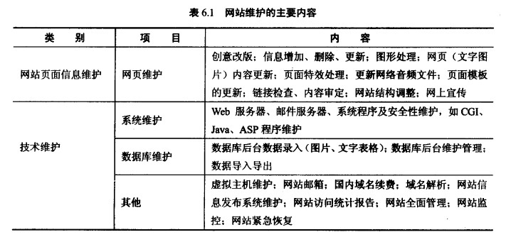 网站的维护包含多方面的工作,一般可分为网站页面信息维护和网站系统技术维护两个方面。网站页面信息维护主要是保证网站信息内容的一致性、完整性及美感和更新及时;而网站系统的技术维护工作主要是指构成网站系统运行平台的软硬件设施、设备正常可靠运转,以及数据资料的可靠、及时的备份。表6.1给出了比较完整的进行网站维护的主要项目和相应工作内容。