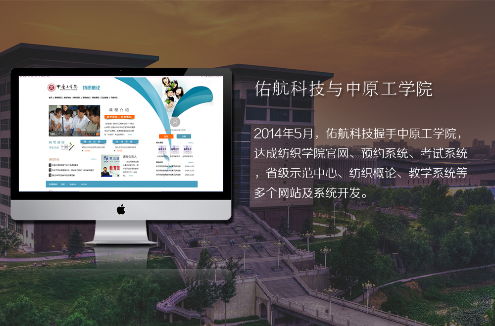 长期以来,佑航科技与中原工学院保持着技术合作关系,在纺织学院官网、预约系统、考试系统、省级示范中心、纺织概论、教学系统等领域,提供技术策划方案、解决方案、服务方案。