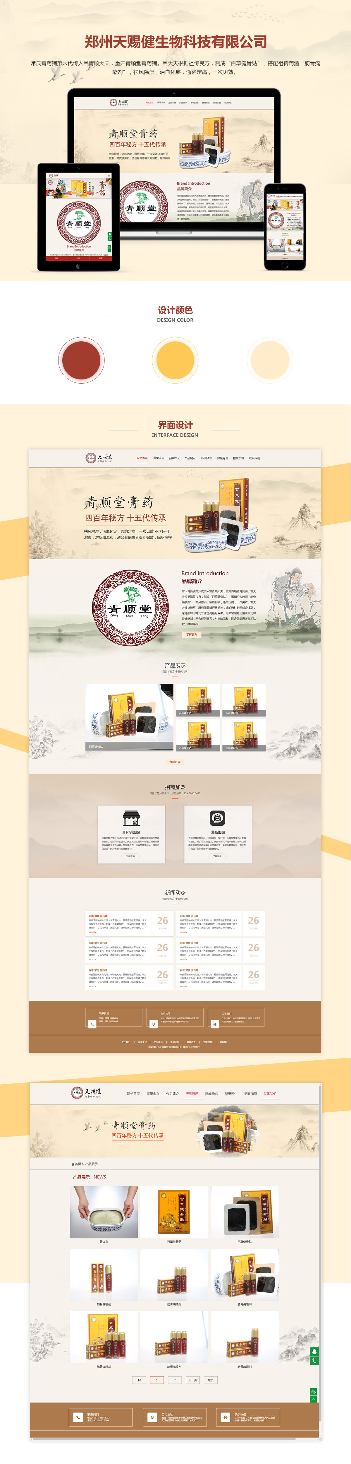 网站开发说明:现代社会随着电脑手机等电子产品的普及,患有颈肩腰腿痛的人越来越多,而且有加速上升的趋势,青顺堂公司创始人常青顺大夫在传承晚清名医常令续大夫救治风湿骨病、颈肩腰椎顽疾一贴见效的祖传秘方的基础上,结合现代医药科技,已将公司发展成为科研、生产、销售为一体的医药企业。网站整体风格采用扁平化+中国风,主题颜色吸取了公司logo的深红色和膏药盒的淡咖色,给人以古朴厚重的感觉,再辅以水墨山水和古代人物作为背景烘托,古色古香,底蕴十足。三个大banner图都是采用中国风背景+产品相关图文的设计方法,突出了膏药的年代久远,疗效非凡,与网站主题十分契合,实属画龙点睛之笔。网站完成后,甲方也给予的相对肯定:佑航设计很出色!