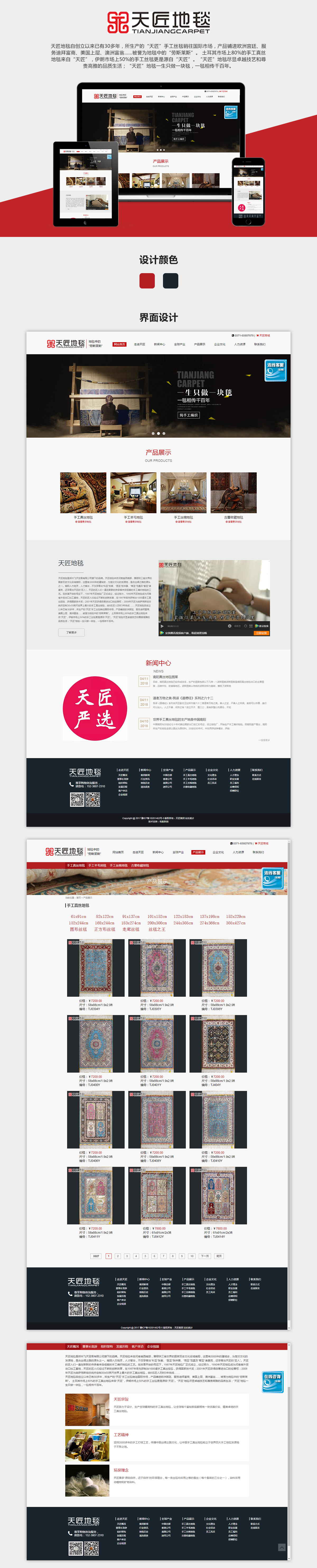 色彩搭配:采用企业logo的大红色作为网站主体颜色,一方面保持了整体色调的和谐统一,另一方面红色热情向上,向客户传递了企业的奋发向上的文化内涵和精神。网站底部的藏青色不仅仅是手工地毯的一个常用色彩,而且给人成熟稳重的感觉,网站中个别字体使用了暗金色,使字体富有层次感。
