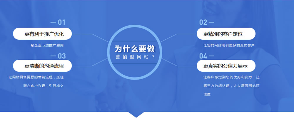 营销型网站,是近几年流行的一种类型的网站,以界面华丽、内容丰富、自营销能力等,快速的成为企业做网站首选。首页很长,按版块放置很多内容,需要突出的仍然是产品,其次是企业优势及服务、简介等,由于其每一块都是独立的中大版块,因此感觉上不会有堆砌感。