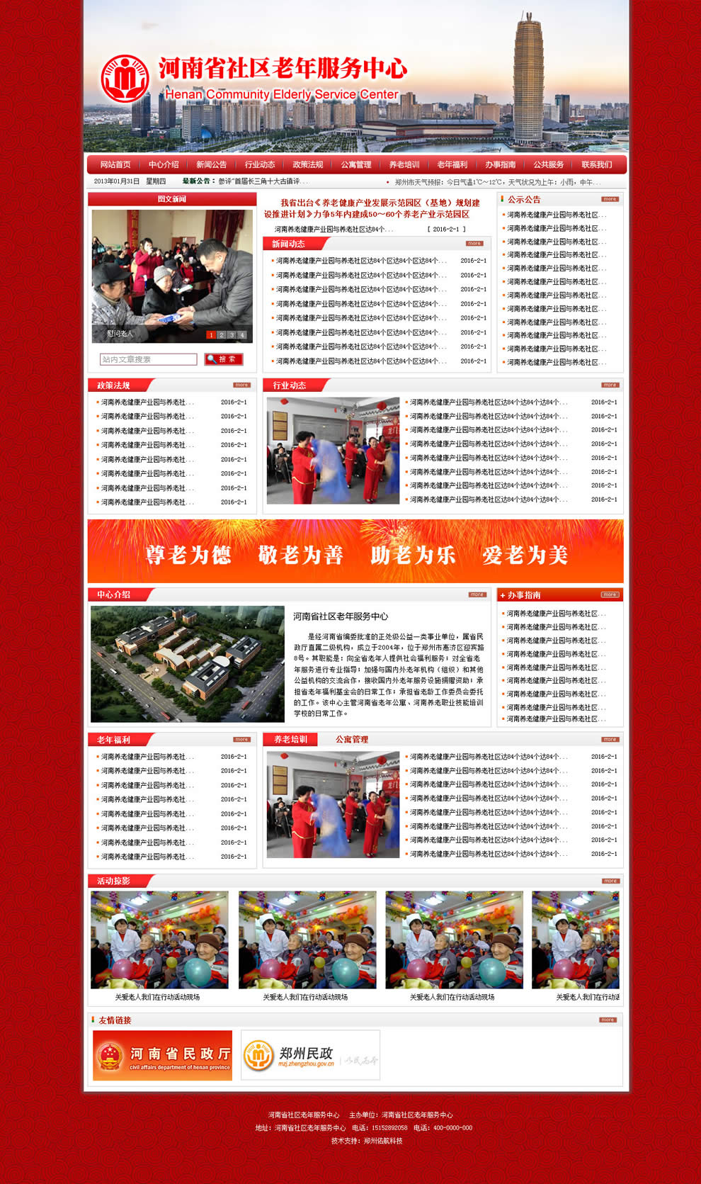 河南省社区老年服务中心,是河南省民政厅下属二级机构,职能是对全省老年服务进行专业指导,及对全省老年提供社会福利服务,属于事业单位性质。政府单位、老年、养老、服务、指导等关键词,决定网站在制作时,应按照政府网站基本模式,加上老年人网站常用的红色、橙色等,来设计制作网站。